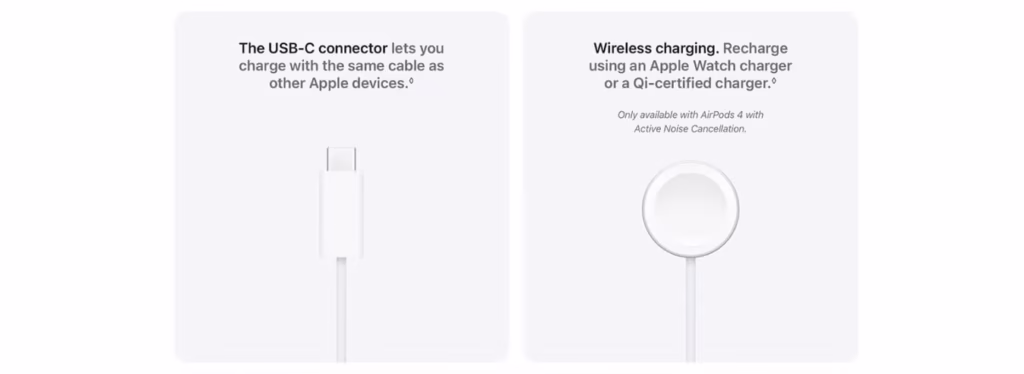 Personalised Spatial Audio with dynamic head tracking2 places sound all around you, creating a three-dimensional listening experience for music, TV shows, movies, games and more. AirPods 4 now offer the option for Active Noise Cancellation in this open-ear design for the very first time. Powered by the H2 chip and upgraded microphones, it helps reduce low-frequency environmental noise — like airplane engines, HVAC systems and city traffic — before it reaches your ears.The streamlined charging case6 is more than 10% smaller by volume than the previous generation7, with no sacrifice to charging times. And AirPods 4 with Active Noise Cancellation feature a wireless charging case — the smallest in the industry with this capability — as well as a built-in speaker for Find My8 to help you keep track of it.
